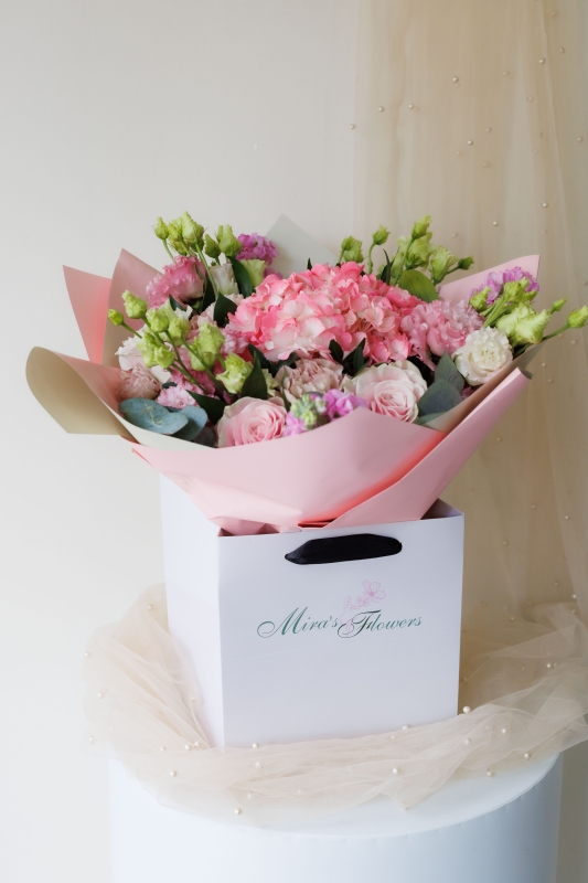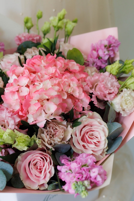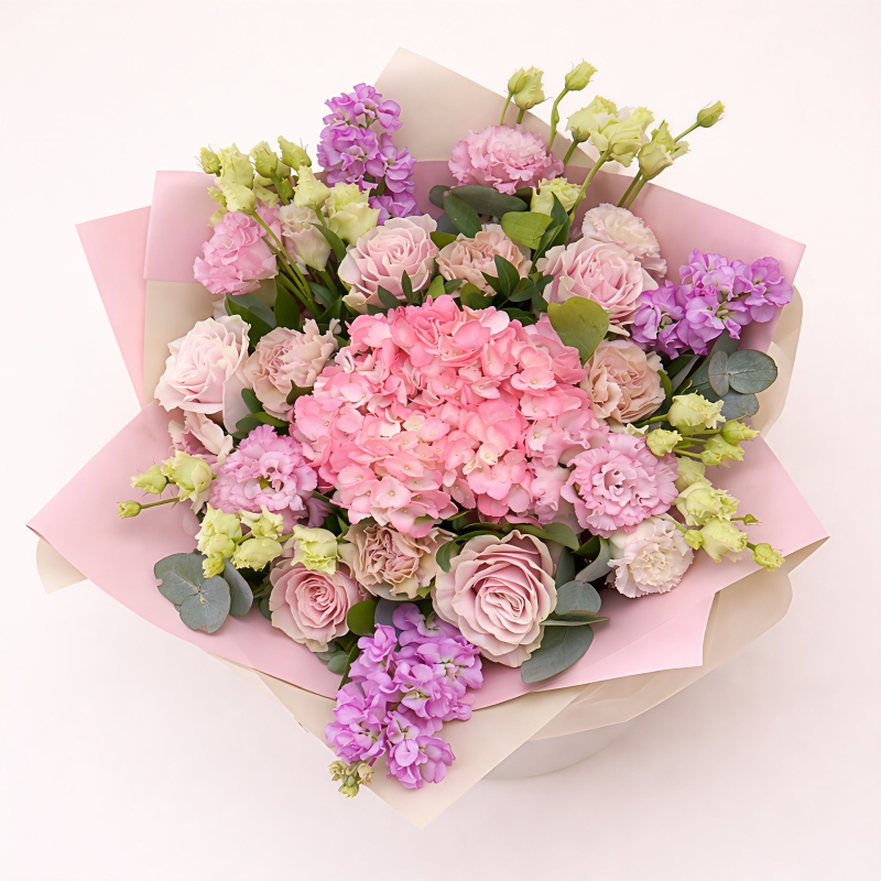 A pastel coloured bouquet featuring hydrangeas, roses, carnations, stock flowers and lisianthus.