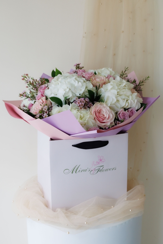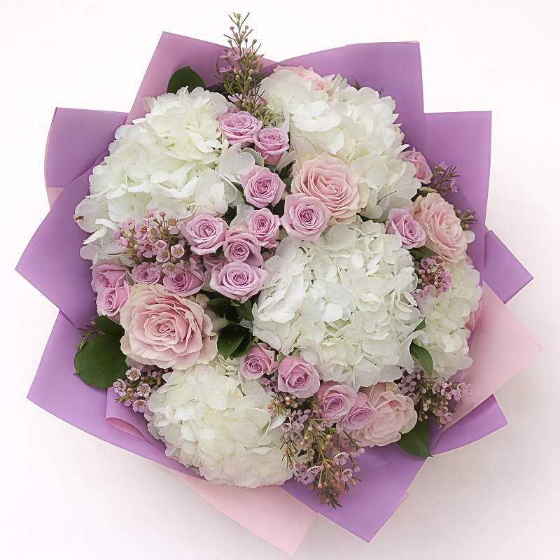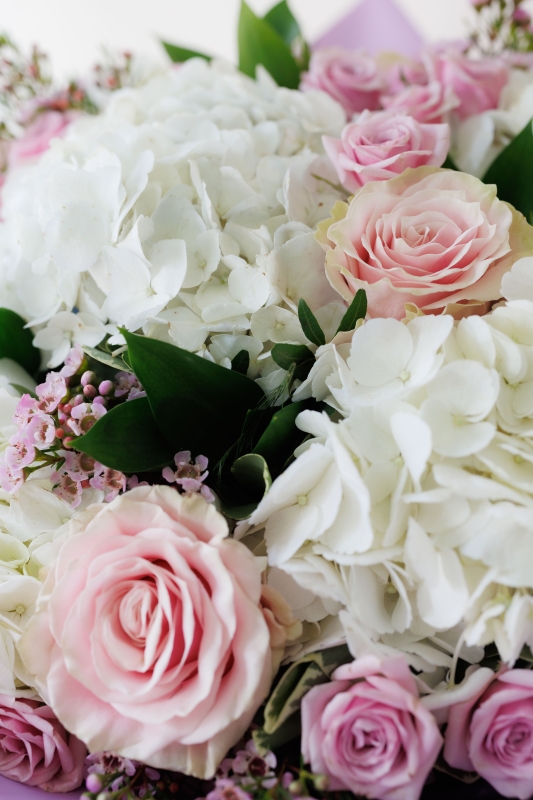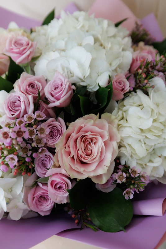 Luxury combination of hydrangeas, pink roses, spray roses and wax flowers.