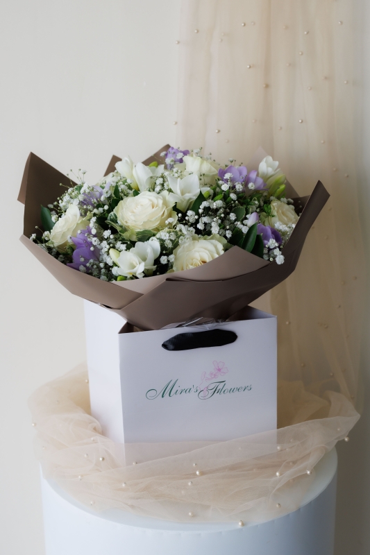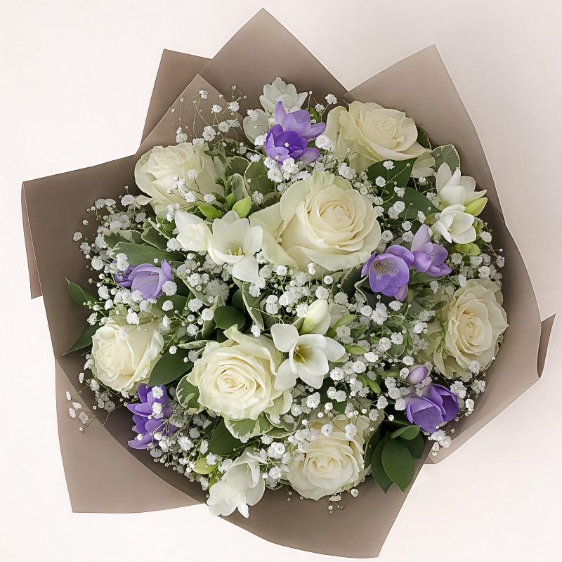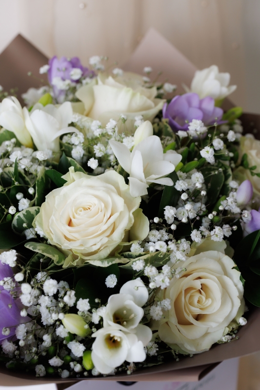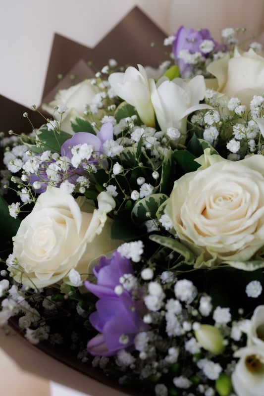 A delicate bouquet of white roses, mix of freesia and gypsophila.